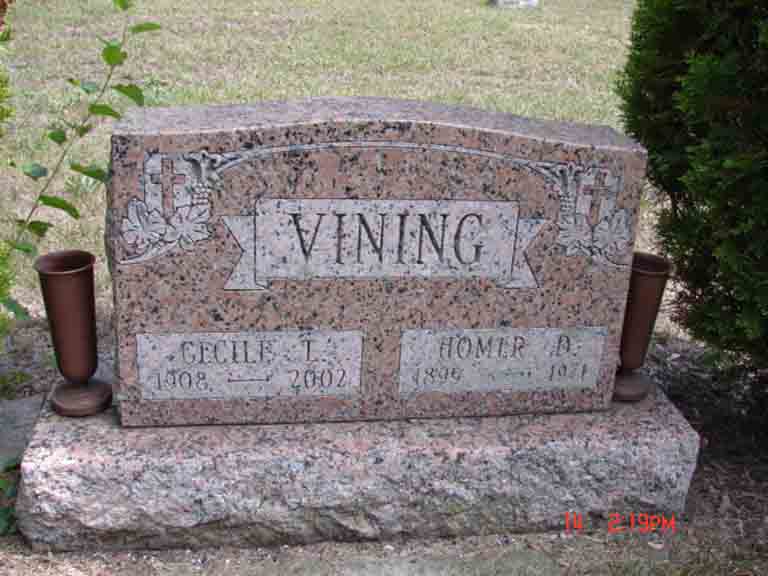 Headstone for Homer D. Vining and Cecile T. ([...]) Vining, in Payne Cemetery, Maple Rapids, Gratiot County, Michigan (from Find A Grave):