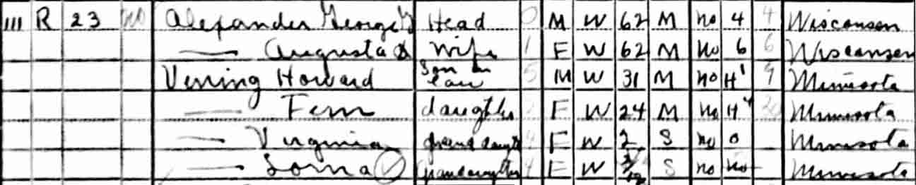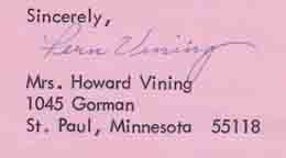 According to a 10 October 1966 letter written by Fern Ione (Alexander) Vining, Howard Herman Vining was “a letter carrier until January 2 [1966], when he fell down our son’s stairs and broke his knee. He was in the hospital for five months, and has had to go into clerking, as he cannot walk well, yet, and will never carry mail again.” She worked at “Sibley High School as Secretary to the Director of Elementary Education and for the Food Services Supervisor.”
