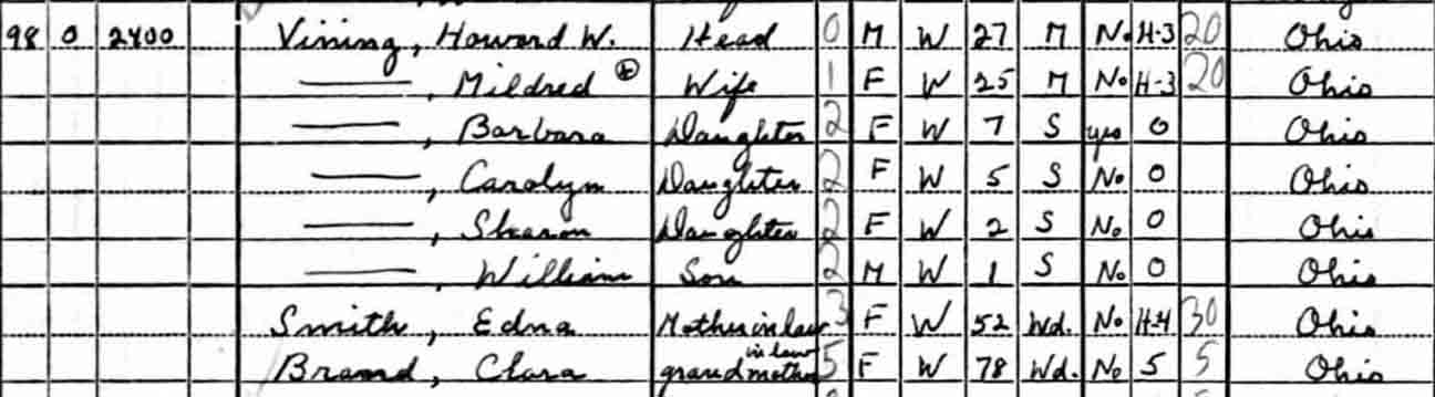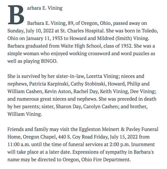Obituary for Barbara Vining, daughter of Howard W. Vining and Mildred (Smith) Vining (source: The Blade, 14 July 2022)