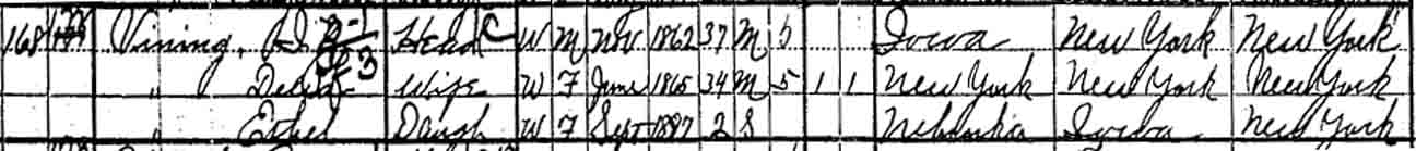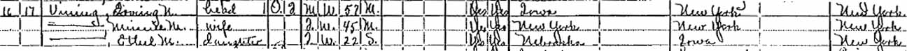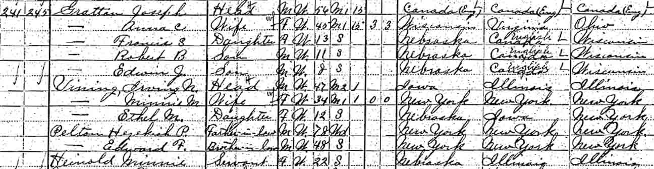 1910 Stanton (Ward 2), Stanton County, Nebraska - dwelling 242 (unnumbered), family 246 (unnumbered). Also living in this household in 1910 were Hezekiah P. Pelton (78 y., b. New York) and Edward F. Pelton (48 y., b. New York), Irving N. Vining's father-in-law and brother-in-law, respectively, and servant Minnie Heinold (22 y., b. Nebraska).:
