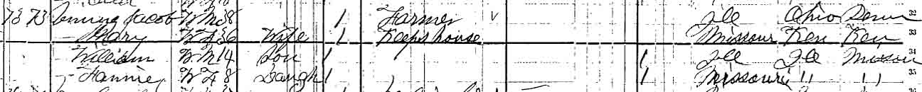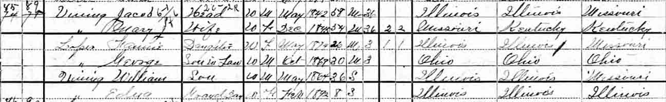 1900 Atlanta Township, Logan County, Illinois - dwelling 85, family 89. By 1900, Fannie Vining was married, to George Lope{r?}, and she and her husband were living in the household of her parents. Also living in this household in 1900 was Edna Vining, listed as a granddaughter, but William Vining was reported as being “S”ingle.: