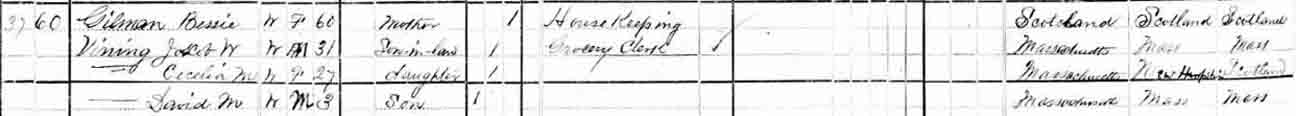 1880 Boston, Suffolk County, Massachusetts - dwelling 37, family 60. Also living in this household in 1880 was Bessie Gilman (60 y., b. Scotland), the mother of Cecelia M. (Gilman) Vining.: