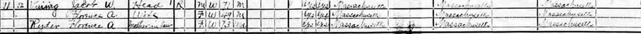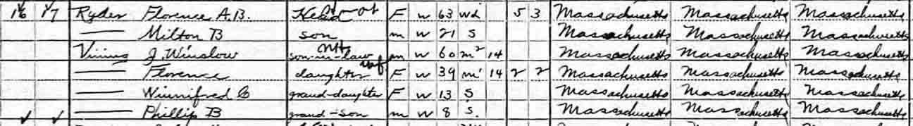 1920 Wakefield, Middlesex County, Massachusetts - dwelling 11, family 12. Also living in this household in 1920 was Florence A. Ryder (73 y., b. Massachusetts), the mother of Florence A. (Ryder) Vining.: