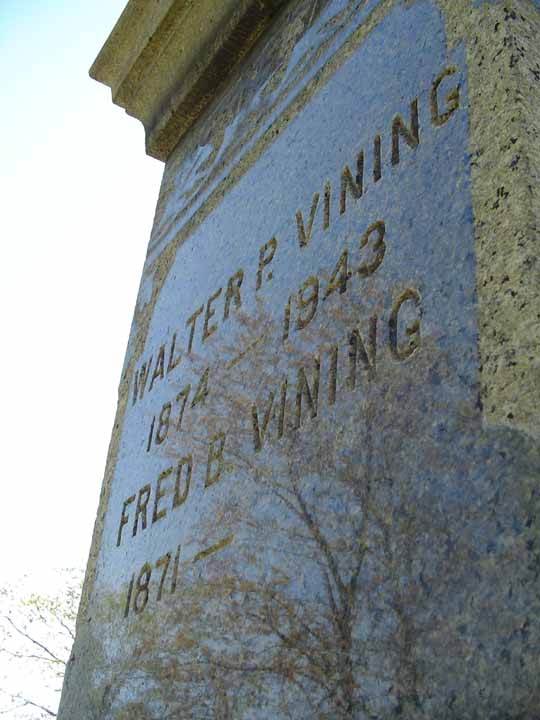 Gravestone of Fred B. and Walter P. Vining, sons of James Vining and Susie D. Clark, in Mount Auburn Cemetery, Auburn, Androscoggin County, Maine: