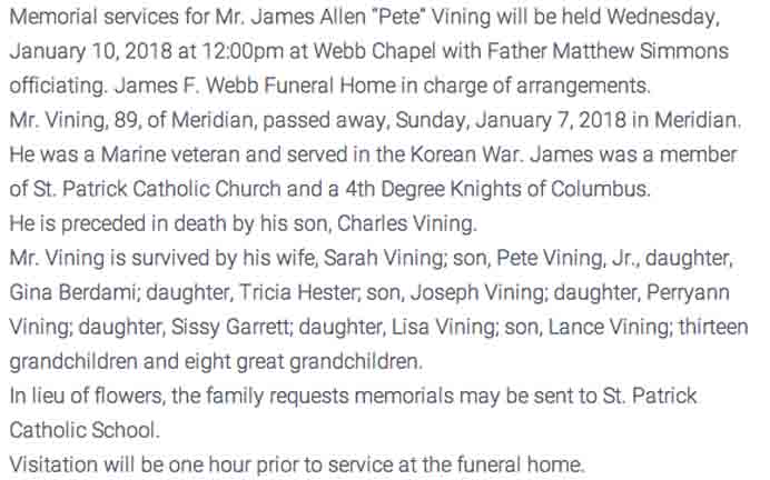 Obituary for James Allen Vining (from James F. Webb Funeral Homes website):