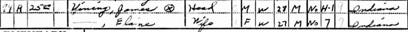 1940 Fort Wayne, Allen County, Indiana. Also living in this household in 1940 was William H. Vining (54 y., b. Indiana), widowed father of James A. Vining.: