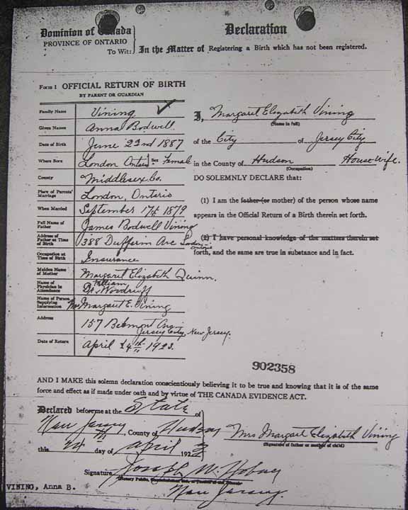 Birth certificate for Anna Bodwell Vining. Note that this certificate records the marriage date and place for Anna's parents.