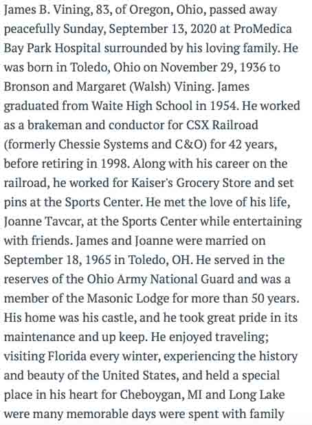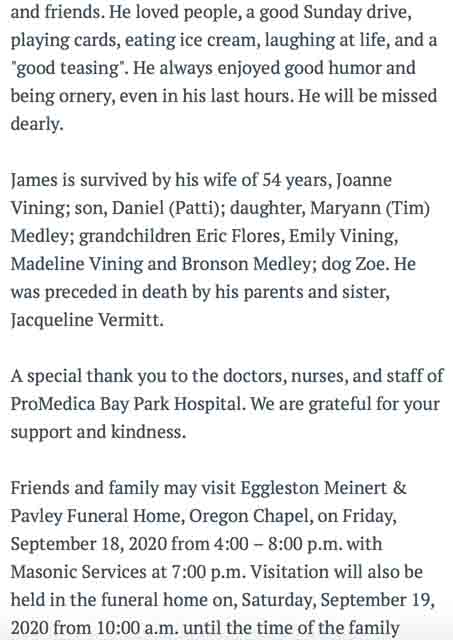 Obituary for James B. Vining (source: Eggleston Meinert & Pavley)