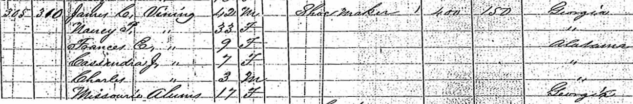 Troy, Pike County, Alabama - dwelling 305, family 310. Also living in this household in 1860 was Missourie Alums (17 y., b. Georgia).: