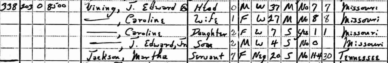 Webster Groves, St. Louis County, Missouri. Also living in this household in 1940 was servant Martha Jackson (20 y., b. Tennessee).: