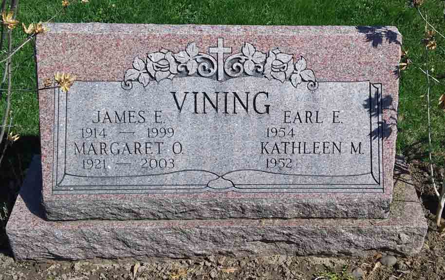 Headstone for James Edward Vining and Margaret F. Miller (Vining), in Huskey Cemetery Niagara County, New York (from Find A Grave):