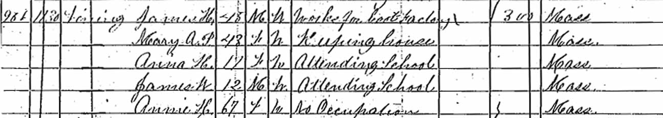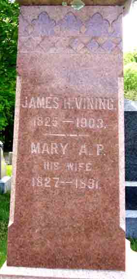 1870 Weymouth, Norfolk County, Massachusetts - dwelling 956, family 1130. Also living in this household in 1870 was Annie H. Vining (no occupation, 67 y., b. Massachusetts), mother of James H. Vining.: