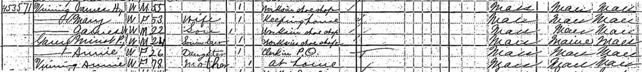 1880 Weymouth, Massachusetts (Norfolk County) - Also living in this household in 1880 were Minot P. Garey (husband of Anna H. Vining, 24 y., b. Massachusetts) and Annie Vining (mother of James H. Vining, 78 y., b. Massachusetts).:
