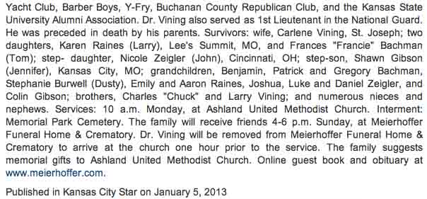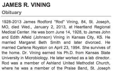 Portion of headstone for James Rodford Vining, in Saint Joseph Memorial Park, Saint Joseph, Buchanan County, Missouri (from Find A Grave):