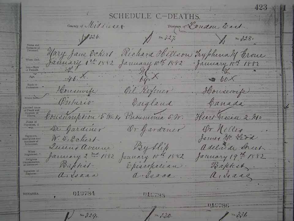 Death certificate (right hand column) for Tryphena Maria (Vining) Crone, daughter of Jared Vining and Charlotte Bodwell: