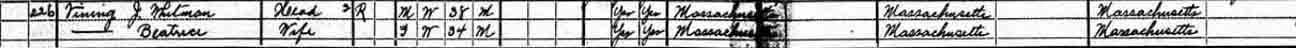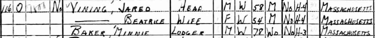 1940 Brockton (ward 3), Plymouth County, Massachusetts. Also living in this household in 1940 was Minnie Baker (78 y., b. Massachusetts), likely the widowed mother of Beatrice E. (Baker) Vining.: