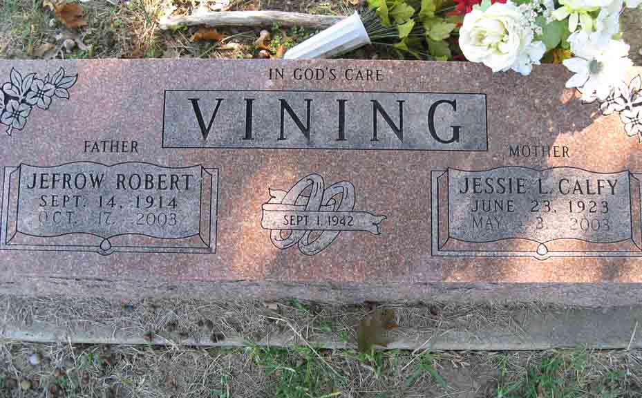 Headstone for Jefrow Robert Vining and Jessie Lee (Calfy) Vining, in Fairview Cemetery, Denison, Grayson County, Texas (from Find A Grave):