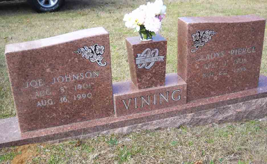 Headstone for Joe Johnson Vining and Gladys (Pierce) Vining, in Cedar Hill Cemetery, Rusk, Cherokee County, Texas (from Find A Grave):