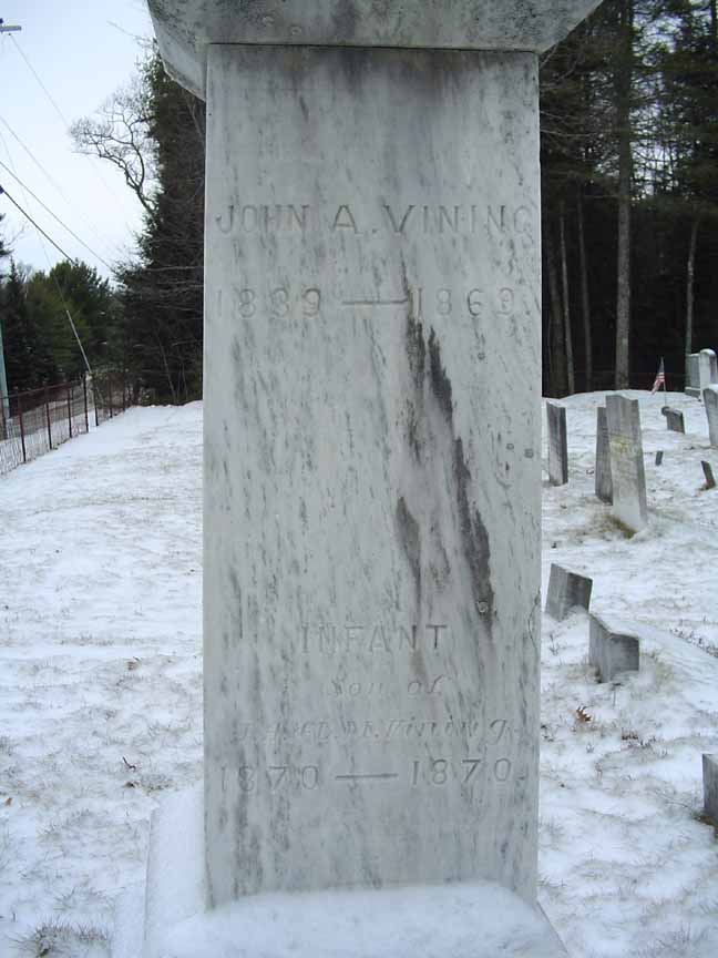 Gravestone of John A. Vining and an infant son, in Vining Cemetery, Durham, Androscoggin County, Maine: