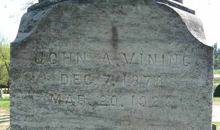 Gravestones of John Albion Vining. The upper one is from one side of the family headstone of Edwin R. Vining and Ada L. (Morse) Vining. These stones are in Mount Auburn Cemetery in Auburn, Androscoggin County, Maine