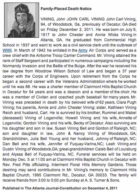 Obituary for John Carl Vining: