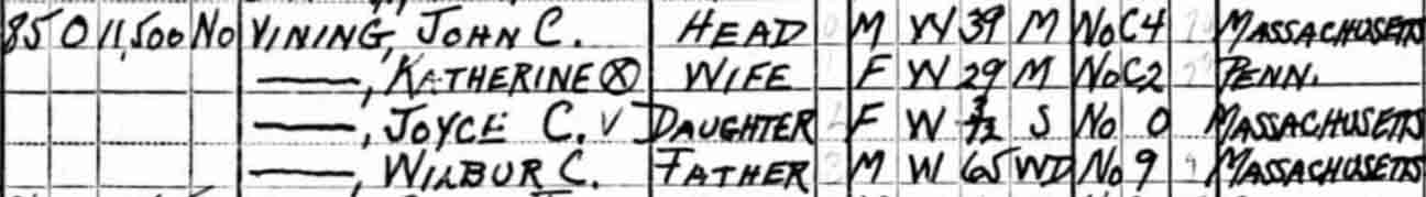 1940 Stoneham, Middlesex County, Massachusetts. Also living in this household in 1940 was Wilbur C. Vining (65 y., b. Massachusetts; father of John Carver Vining).: