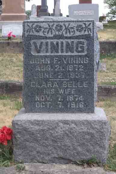 Headstone for John Franklin Vining and Clara Belle (Hershberger) Vining, in Etna Green Cemetery, Etna Green, Kosciusko County, Indiana (from Find A Grave):