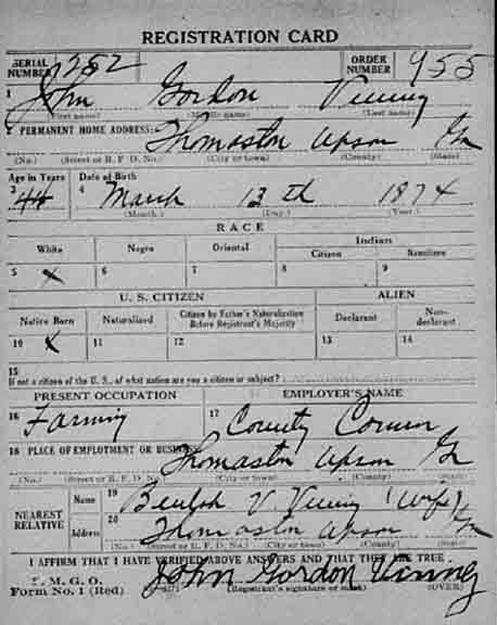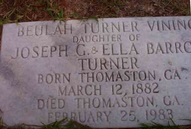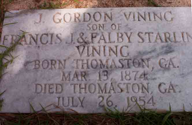 Gravestones for John Gordon Vining and Beulah (Turner) Vining, in Southview Cemetery, Thomaston, Upson County, Georgia (from Find A Grave):