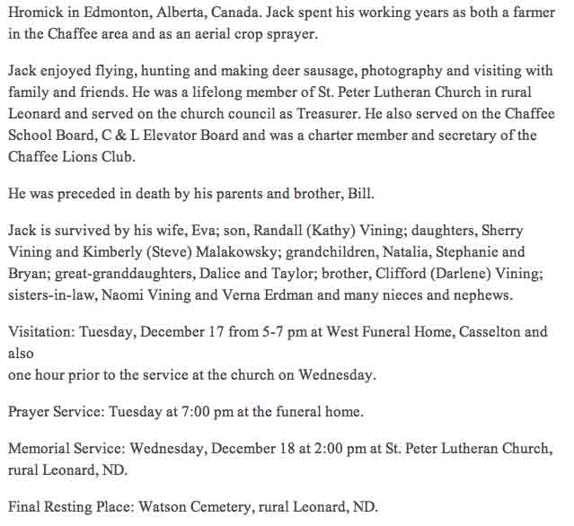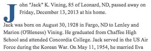 Gravestone for John Keith Vining, in Watson Cemetery, Leonard, Cass County, North Dakota (from Find A Grave):