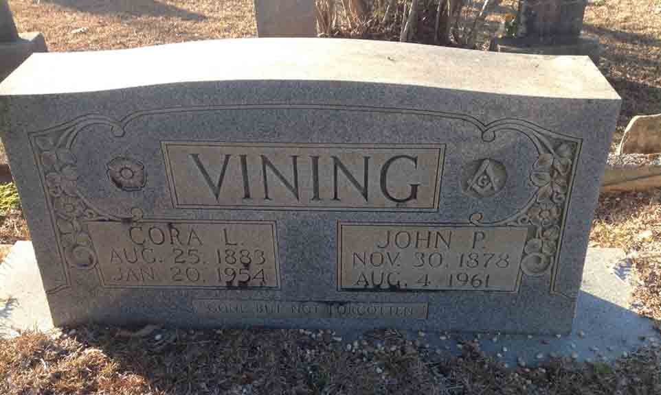 Headstone for John P. Vining and Cora L. ([…]) Vining, in Hickman Chapel Cemetery, Tuscaloosa County, Alabama (from Find A Grave):