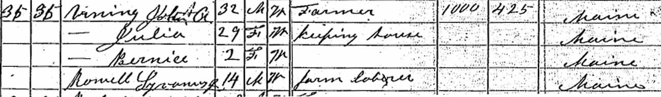 1860 It is possible that the John Vining above was reported to be living with a Reynolds family (dwelling 103, family 120) in their 1860 Canton, Oxford County, Maine, household in addition to being reported as a member of his parents' household.: