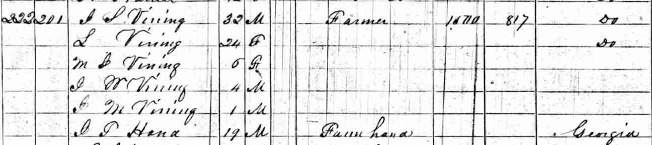 A newspaper obituary written by “a friend” said that John Sanders Vining and Elizabeth Louiza (Worthington) Vining has “fifteen children, six dying in infancy and six lived to be grown.” This leaves some question as to whether there were four or seven children not accounted for below.Census Data