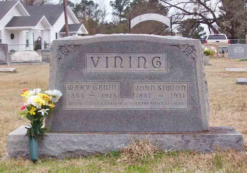 Headstone for John Simion Vining and Mary (Geuin) Vining, in Beulah Cemetery, Calhoun, Ouachita Parish, Loisiana (from Find A Grave):