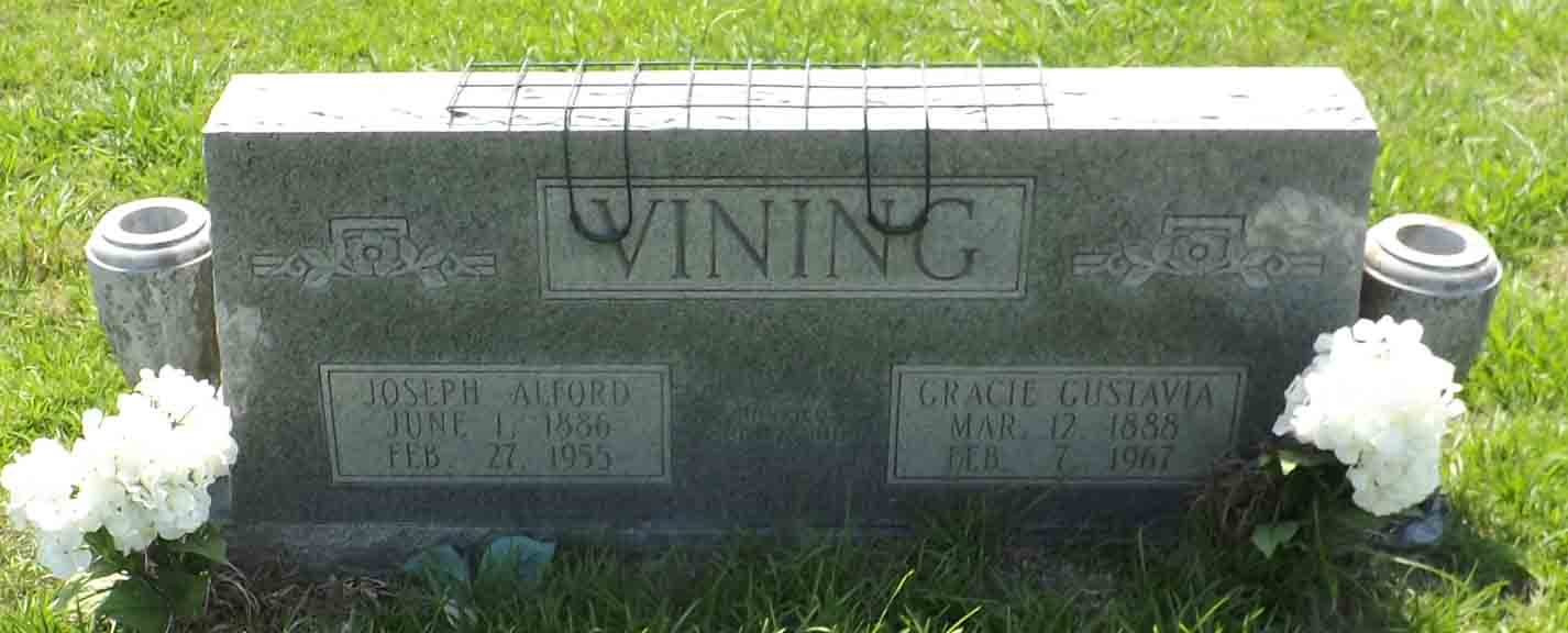 Headstone for Joseph Alford Lee Vining and Gracie Gustavia (Fryday) Vining, in New Forest Cemetery, Forest, West Carroll Parish, Louisiana (from Find A Grave):