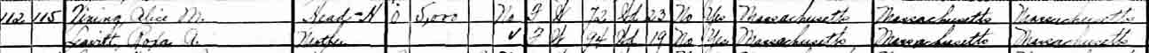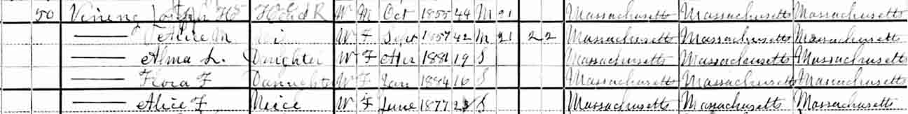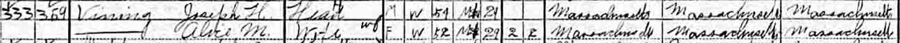 1900 Hanover, Plymouth County, Massachusetts - dwelling 47, family 50. Also living in this household in 1900 was Alice F. Vining (b. June 1877, Massachusetts), a niece of Joseph Henry Vining and Alice M. ([…]) Vining.: