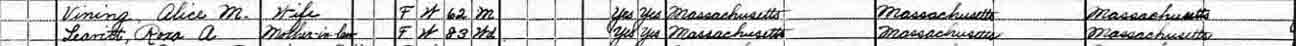 | Alice M. (Leavitt) Vining | ? | 42 | 52 | 62 | 72 | 82 |