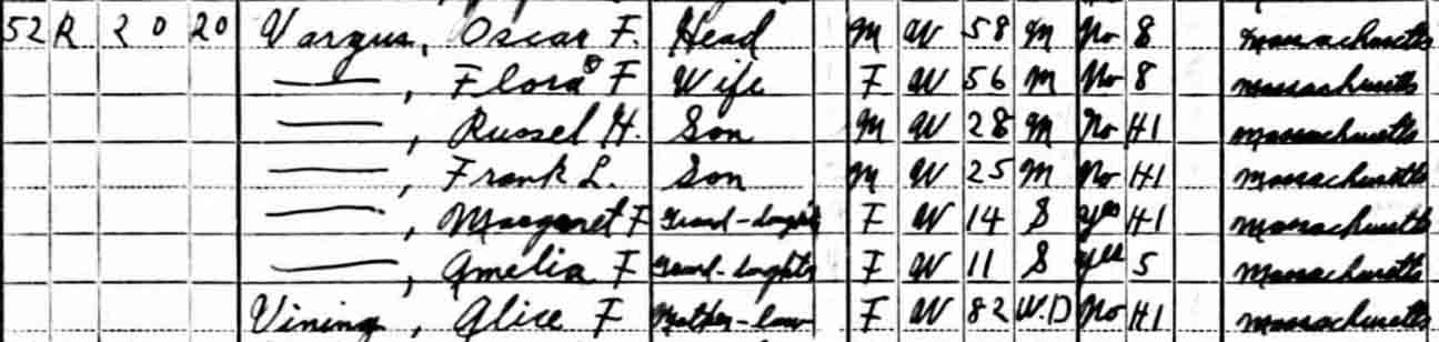 1940 Rockland, Plymouth County, Massachusetts. In 1940, Alice M. (Leavitt) Vining was living in the household of daughter Flora F. (Vining) Vargus.:
