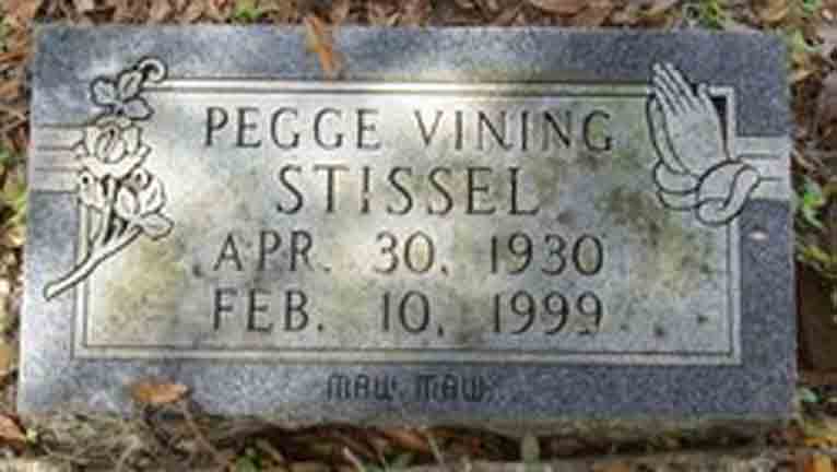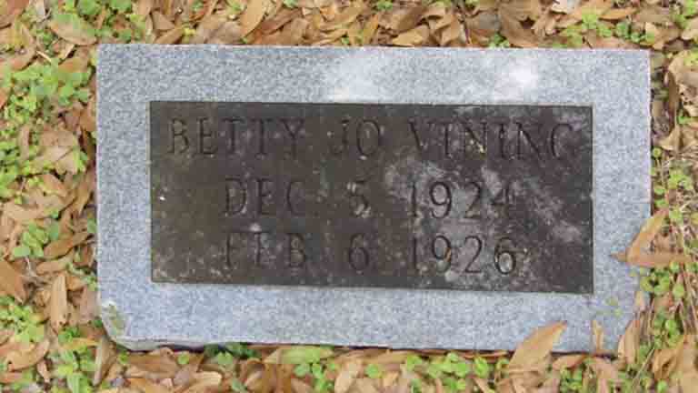 Gravestones for Betty Jo Vining and Pegge Jane (Vining) Stissel, daughters of Joseph Oswald Vining and Ida Sue (Britt) Vining, in Greenwood Cemetery, Orlando, Orange County, Florida (from Find A Grave):