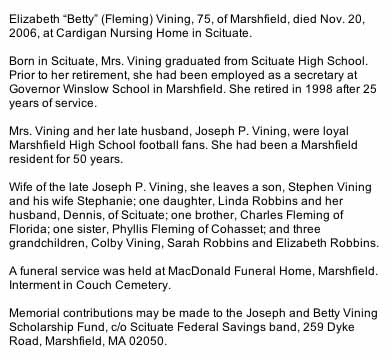 Obituary for Elizabeth Marie (Fleming) Vining; from Cohasset Mariner (online posting), Friday, 1 December 2006 issue: