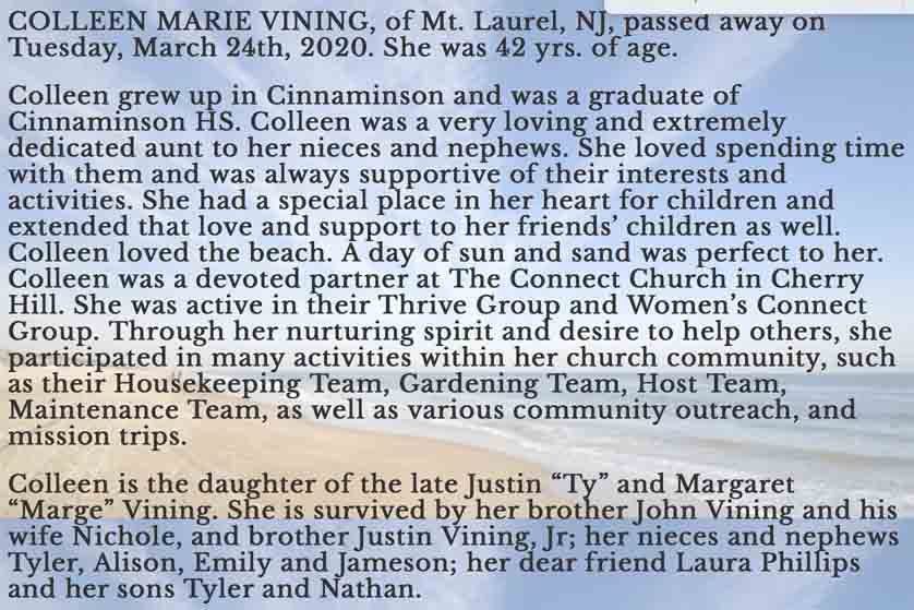 Obituary for Colleen Marie Vining, daughter of Justin C. and Margaret Mary (Jordan( Vining (from website of Bradley & Stow Funeral Home):