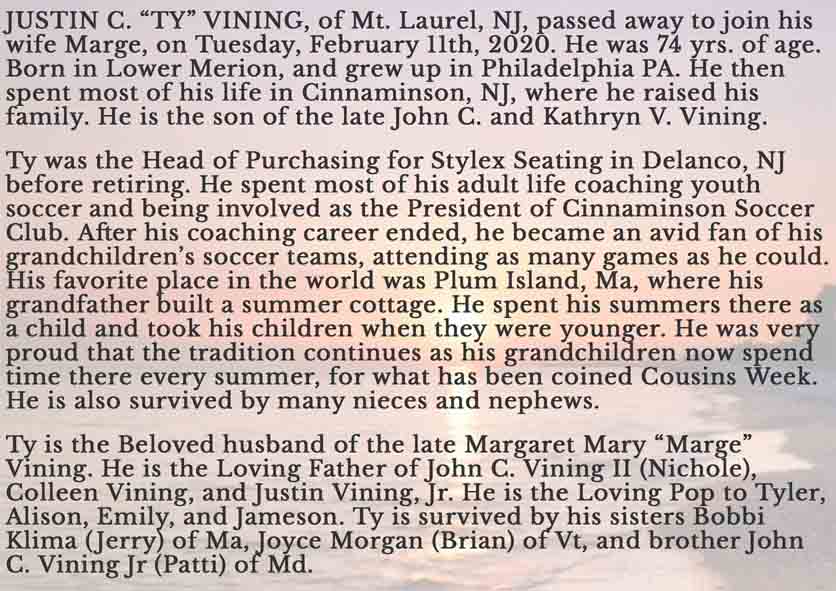 Obituary for Justin C. Vining (from website of Bradley & Stow Funeral Home):