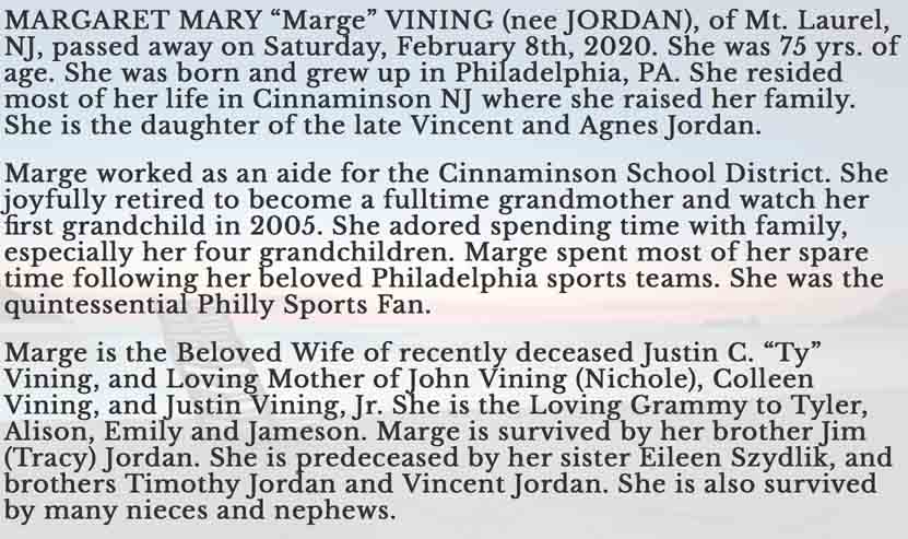 Obituary for Margaret Mary (Jordan) Vining (from website of Bradley & Stow Funeral Home):