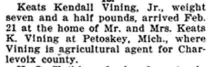 Birth announcement for Keats Kendall Vining Jr. (in The M.A.C. [Michigan Agricultural College] Record, Vol. XXIII, No. 25, page 16):