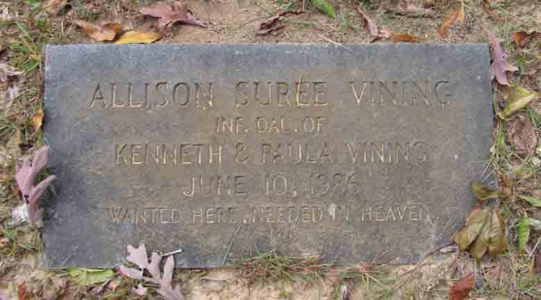 Gravestone for Allison Suree Vining, daughter of Kenneth Vining and Paula ([...]) Vining, in Macedonia Cemetery, Shelby County, Alabama (from Find A Grave):