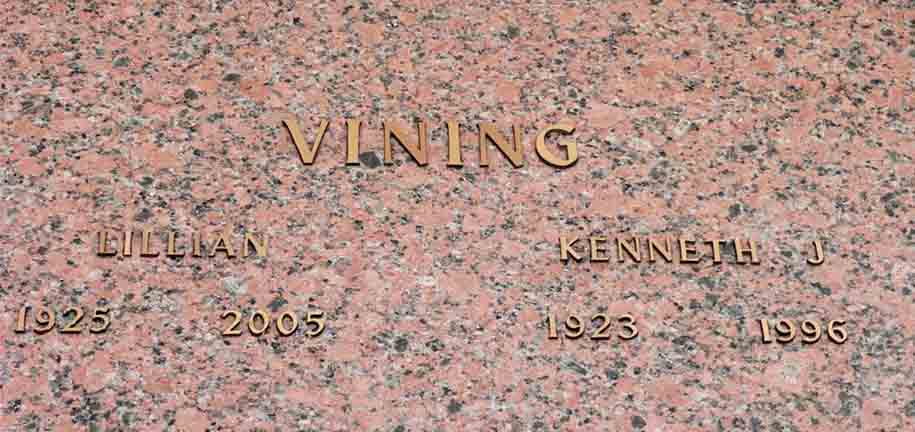 Headstone for Kenneth Jay Vining and Lillian Ropic, in Vestal Hills Memorial Park, Vestal, Broome County, New York (from Find A Grave):