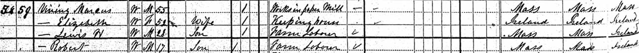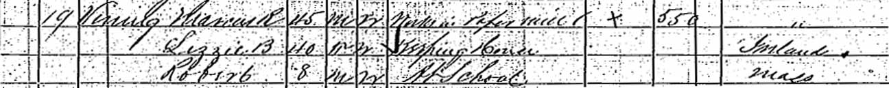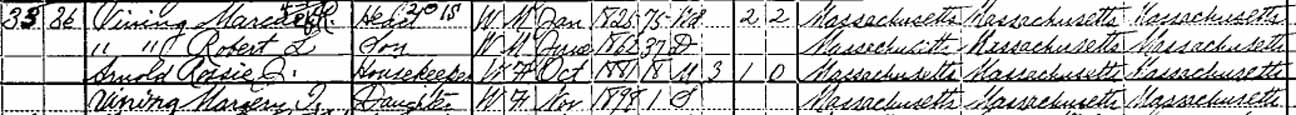 1900 Cummington, Hampshire County, Massachusetts - dwelling 35, family 36. Also living in this household in 1900 were Rossie J. Arnold (housekeeper, b. October 1881, Massachusetts) and Margery [I.?] Vining (daughter [of Robert Latham Vining?], b. November 1898, Massachusetts).: