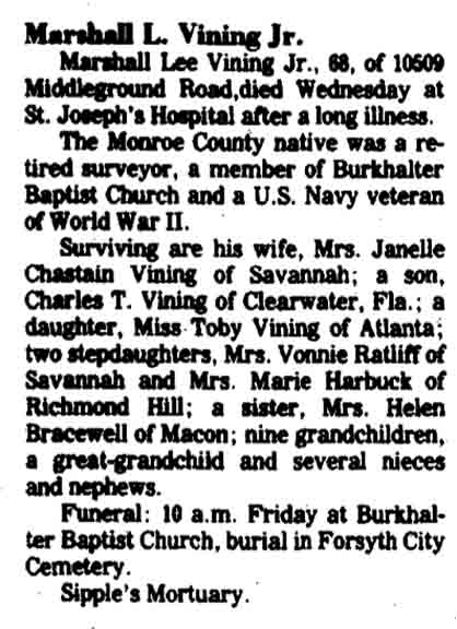 Obituary for Marshall Lee Vining Jr. (from Savannah Morning News, 19 April 1990, page 3C):