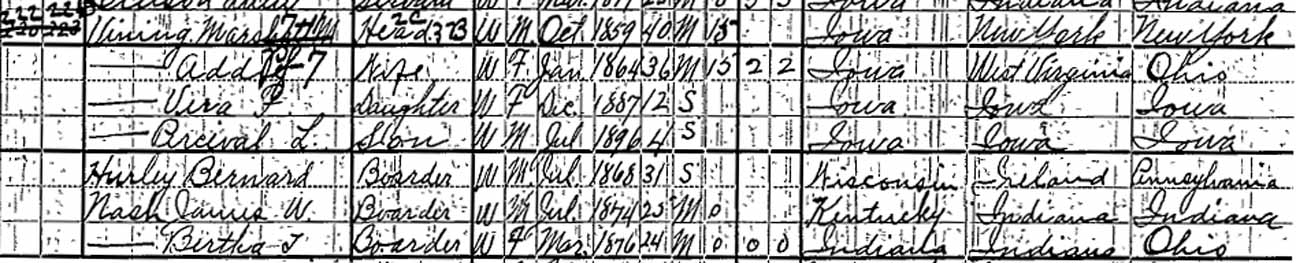 1900 Boyer Township, Harrison County, Iowa - dwelling 222, family 226. Also living in this household in 1900 were three boarders: Bernard Hurley (31 y., b. Wisconsin), James W. Nash (25 y., b. Kentucky), and Bertha T. Nash (24 y., b. Indiana).: