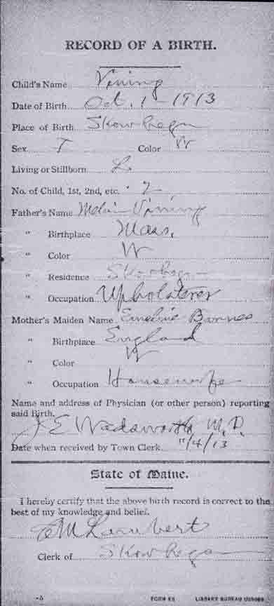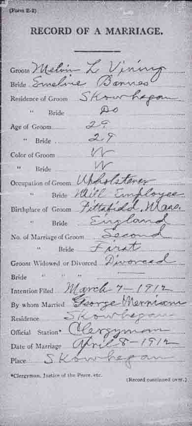 ← Back to Melvin Lapham Vining - (1) Hazel Elliott; (2) Emeline Barnes; (3) Olga Marie Laine