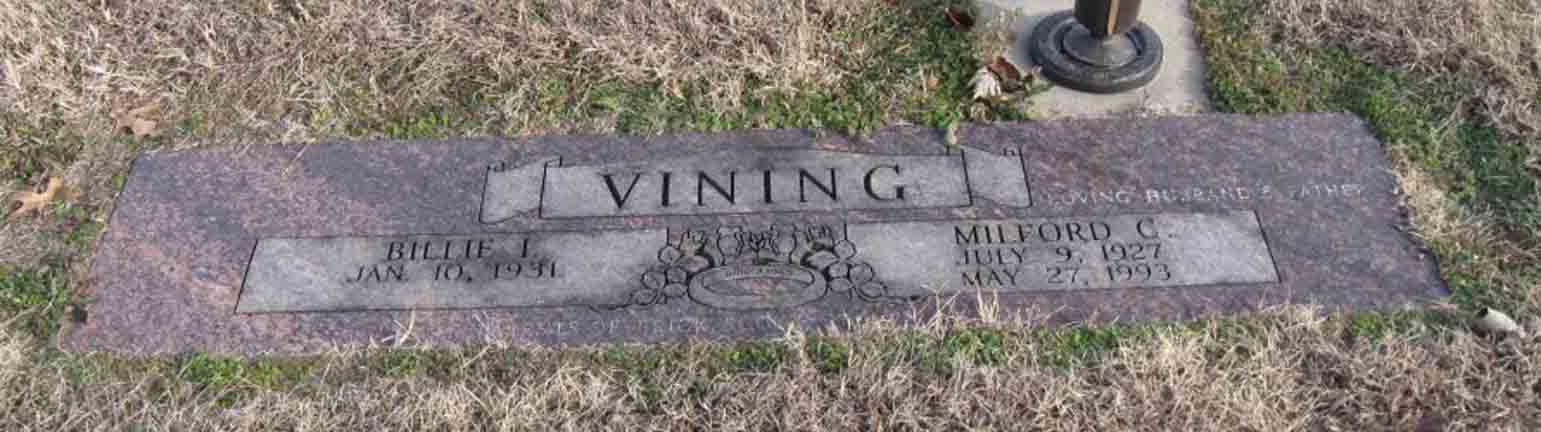 Headstone for Milford Claire Vining and Billie Inez (Morgan) Vining, in Memorial Lawn Cemetery, Arkansas City, Cowley County, Kansas (from Find A Grave):